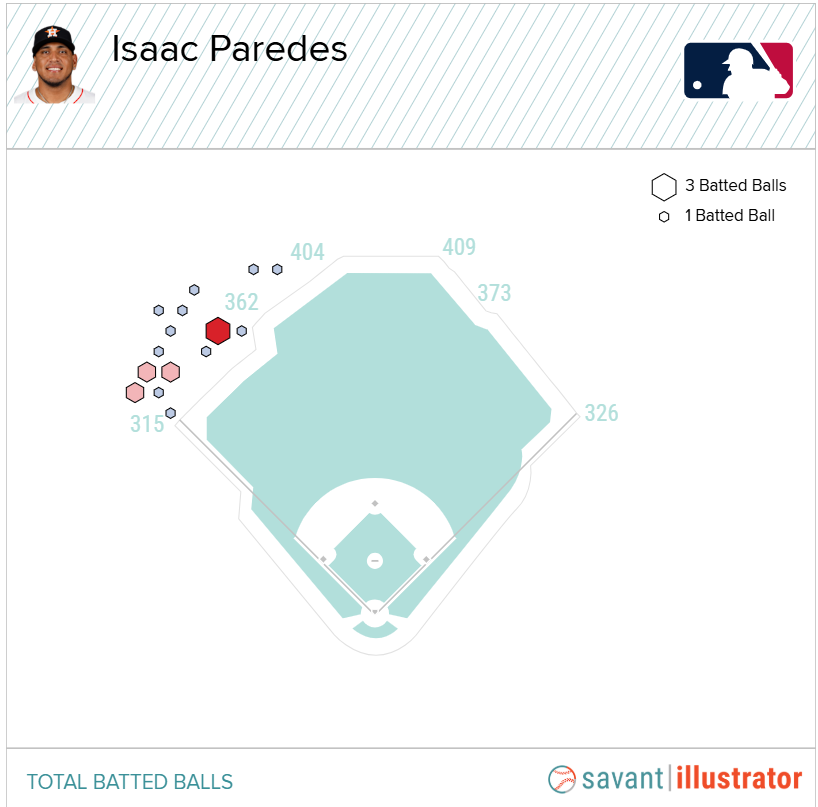For Paredes, other teams value him less than the Astros do because they lack short left field provided by the Crawford Boxes. Paredes led the majors in 2025 in the share of balls that he pulled and the share of balls that he pulled into the air. This allows for Paredes to be a home run threat despite not hitting the ball very hard—he was in the 14th percentile in both exit velocity and hard-hit rate in among all major leaguers in 2025; he finished in the 20th percentile in barrel rate. Paredes has the most unique swing in the majors, sending as many fly balls as possible into left field. Having a short left field porch maximizes Paredes’ value. You can see this from his home run chart last year (below), all of which went to left field.
