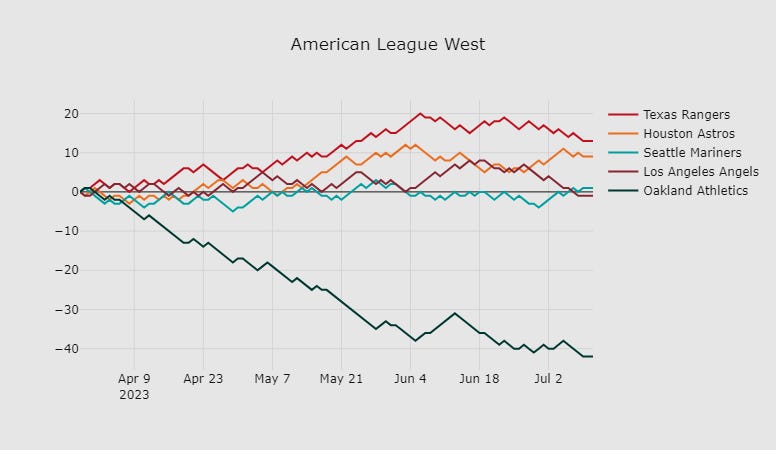 And possibly the best news of all is that the Rangers are starting to play more like we expected in the offseason—they have gone 5-11 since June 23 and have lost 4.5 games off of their lead against the Astros in the AL West.
