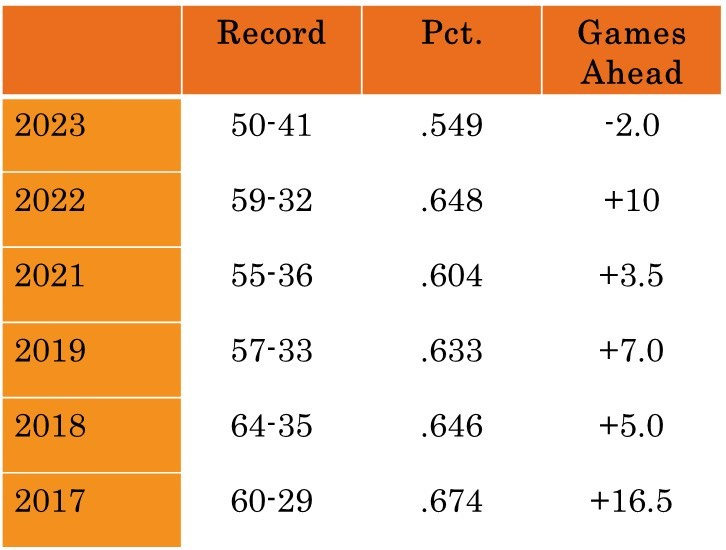 And there is a good reason for those expectations. They have been met in each of the last five full seasons. The table below shows the Astros record at the All Star break from 2017 through this season.1